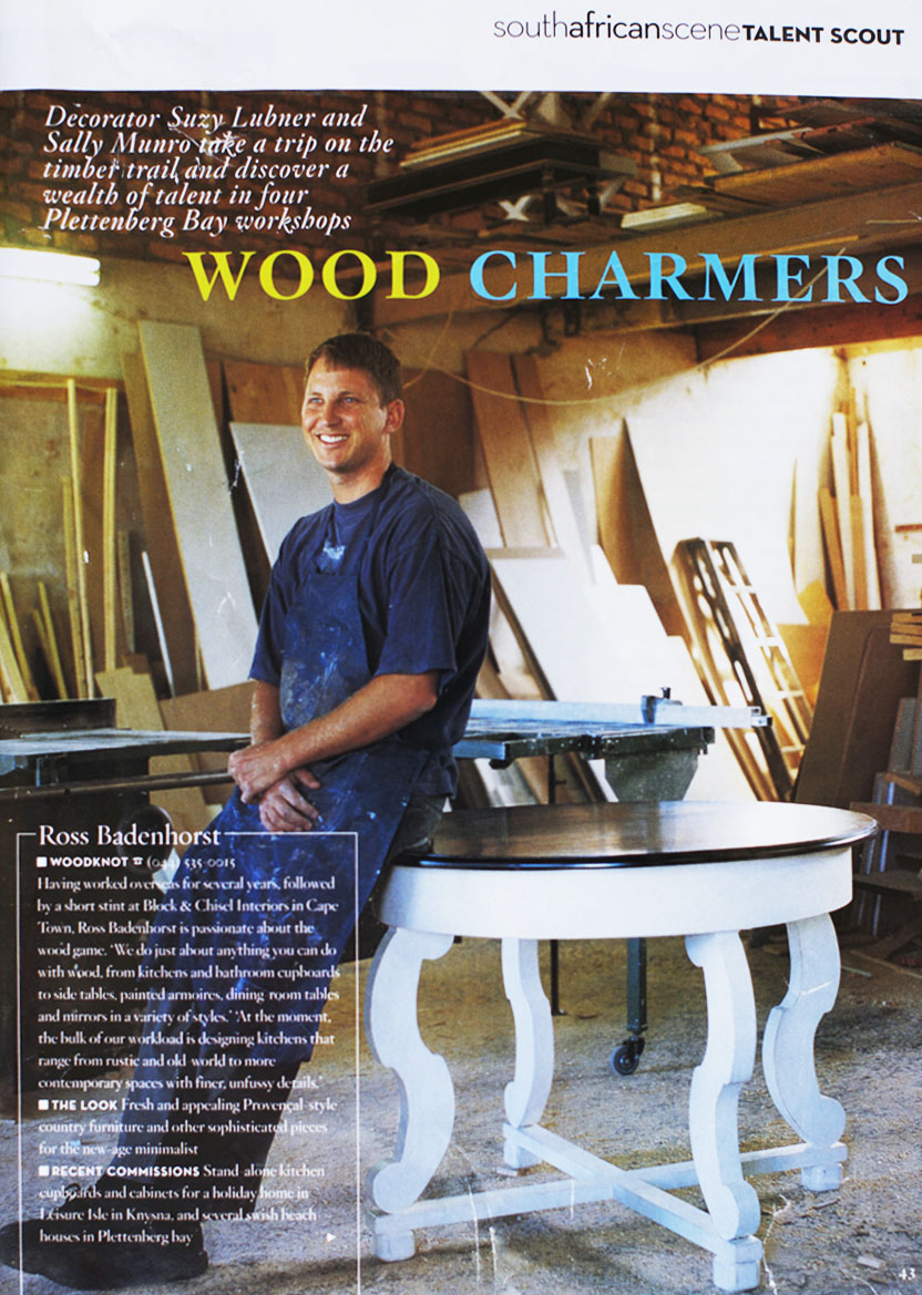Following some time at Block & Chisel Interiors in Cape Town, Ross Badenhorst opened Woodknot in Plettenberg Bay in 2002, offering bespoke furniture and custom kitchens. Woodknot specialises in all things wood, from dining tables, armoires, side-tables, desks, chairs or any specialist item that clients may require. With a strong focus on style and attention to detail in the manufacturing process, their flexible approach and understanding of the client's needs, have seen Woodknot fit kitchens and manufacture furniture for some of Knysna and Plettenberg Bay's most upmarket homes.
